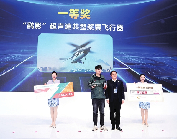 会上宣读了大赛作品征集和评审情况,并宣布获奖名单。自6月12日启动以来,本次大赛共征集到来自南京航空航天大学、天津大学等知名院校,集团成员单位以及广大航空爱好者等参赛作品51份。经专家评审及网络投票,“‘鹞影’超声速共型桨翼飞行器概念方案设计”获一等奖;“‘飞鲸’模块化三旋翼重型无人直升机”及“‘动力环’飞行器”获二等奖;“YQ-5空陆两栖火星探测器”“中国未来民用直升机设计”获三等奖;“无影-Q复合倾转旋翼武装无人直升机”获创意达人奖;“‘探望者’飞行器”获最具人气奖。